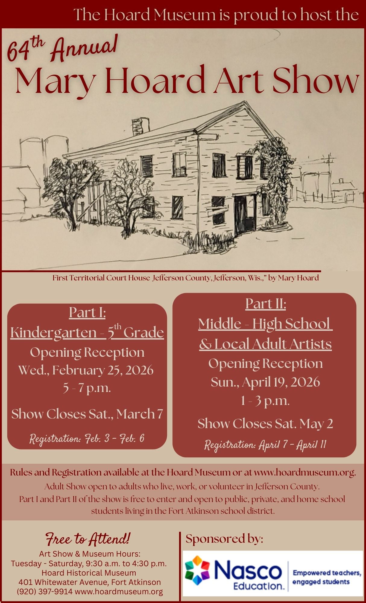 The Mary Hoard Art Show is a two-part event showcasing the immense creative talent within our community. Part 1 features artwork from young artists in grades K-5, while Part 2 highlights impressive entries from middle and high school students and Jefferson County adults. With a variety of 2D, 3D, and digital works on display, this annual exhibition celebrates local artistry across all ages and skill levels. Admission to the museum is free, and the show is open to the public during regular museum hours.